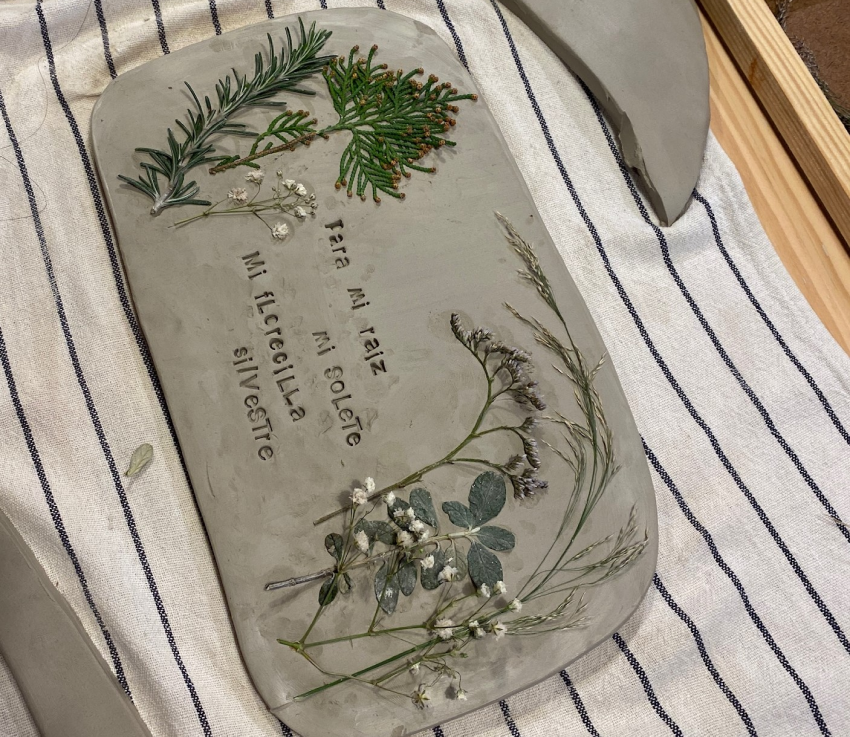 En este taller crearás una bandeja de cerámica única, combinando técnicas de modelado a mano con estampación botánica. Usaremos flores y hojas frescas para transferir sus formas y texturas sobre el barro, dejando una huella natural que convierte cada pieza en algo irrepetible.